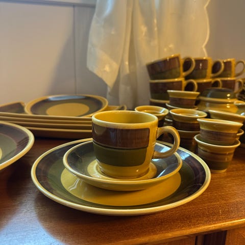 3 stk kaffekopper med skåler. Høyda: 7 cm. Ene har Uvisst skadet og de 2 andre har friskader.