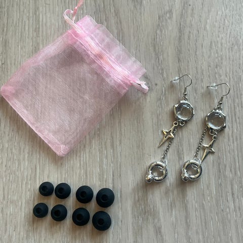 De er nye og har også krok som er trygg i tilfelle du er på danseparty og skulle komme bort i noen som river dem ut. Slik at du ikke får skade på Øra.