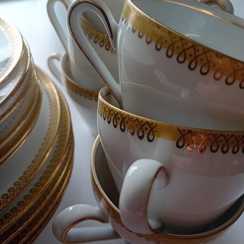 Stilig kaffe- og teservise til 12 personer. Samme skål både til kaffe- og tekoppen (færre skåler å stable). Flott tekanne! Serviset er lite brukt og fremstår som ubrukt. Bud over kr 3000