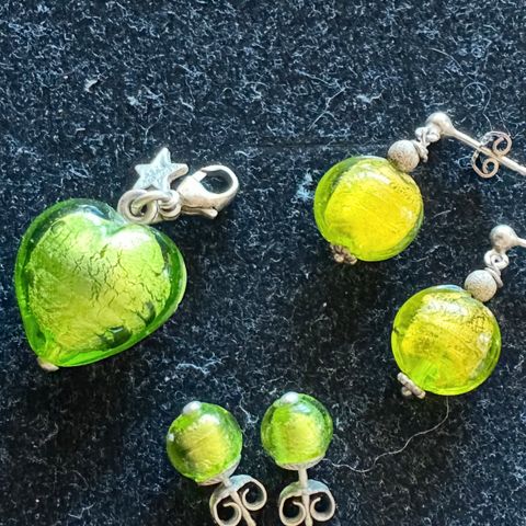Smykke, øredobber og anheng til smykke eller armbånd i limegrønn selges.
