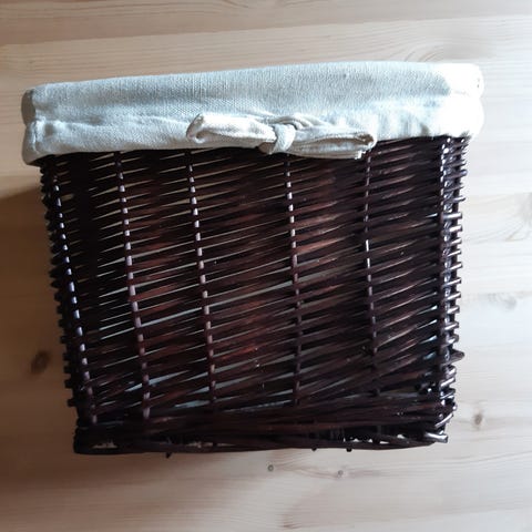 Nydelig kurv til oppbevaring i naturmateriale. Pent brukt med mål: 30x30x35 cm. Høyden kan justeres ved hvor langt kanten brettes ned. Kan komprimeres når den ikke er i bruk. Ikke lenger tilgjengelig på nett eller i butikk.