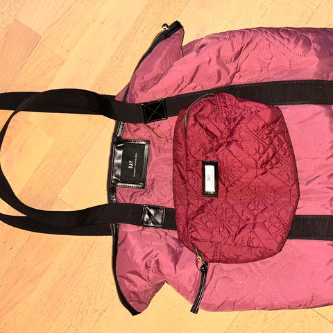 Rød stoffveske med svart glidelås og håndtak. Vesken har et romslig hovedrom med glidelås, samt en innvendig glidelåslomme for oppbevaring av små gjenstander.