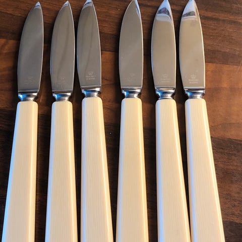 Retro-bestikk fra 50-tallet - sjelden hvit bakelitt - ROSTFRITT STÅL 8 bordkniver