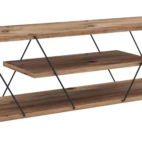 TV-benken er laget av grovt mangotre, et tropisk løvtre som har styrken til å bære vekten og tåler også tidens tann. I tillegg gjør det utsøkte håndverket og de vakre trekornene hvert stykke litt annerledes enn det neste. Bena i pulverlakkert jern gir ekstra stabilitet. Bunnhyllen gjør at du kan holde DVD-spillere, spillkonsoller, streamingenheter og mediebærere pent organisert.