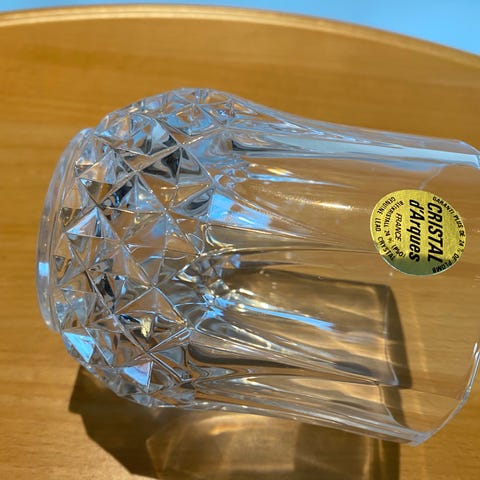 Et krystallglass med mønster. Se bilde. Høyde 9 cm. Uten skader. Selges Ny Pris 70 kr. Kan sendes. Tar vipps