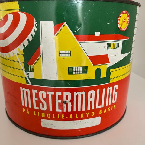 Selger her et gammelt spann med pasta lim for belegg. Spannet er tomt.