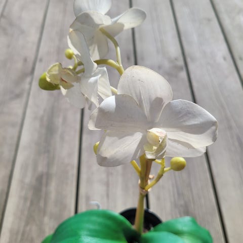 Liten kunstig orkidé, kan settes i krukke eller vase. Lengde 40 cm før rettet til, med utbrettet blader og bøyd stilk blir den på rundt 20 cm høyde. Fin som borddekorasjon.