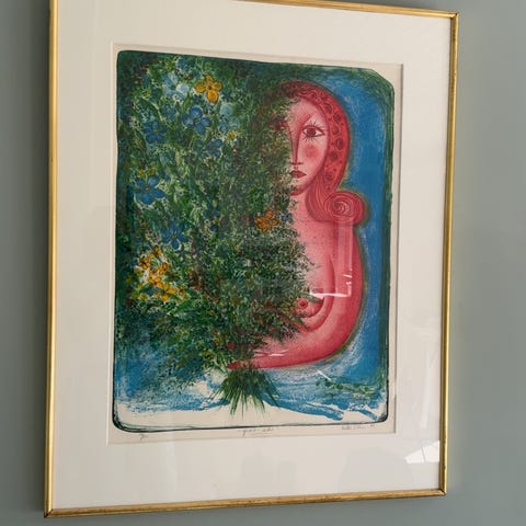 Flott akvarell-maleri (46 x 68) selges. Ramme i metall og glass.
