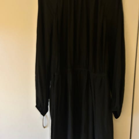 Svart kjole i nydelig stoff fra By Malene Birger i størrelse 36. Sømmen på ene armen er løsnet og bør syes/strykes på plass igjen. Det er fire lommer på kjolen: to framme på brystet og to på innsiden av «skjørtet».