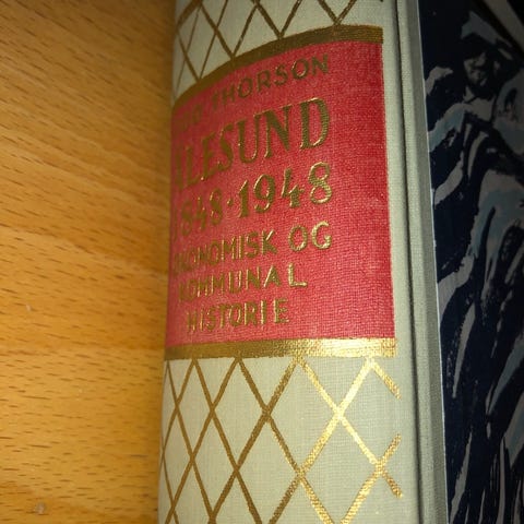 Odd Thorson: Ålesund 1848 - 1948: Økonomisk og kommunal historie; bind I: 1848 - 1904, Fabritius & Sønners trykkeri, Oslo 1948. 458 sider. Uten omslag. Pen materie. Flott fargekart over Ålesund 1944 ( Utarbeidet av Ragnvald Hansen) innlagt i boken. (Kr. 150,-)