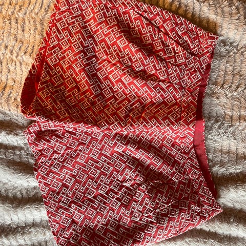 Skjørt med innerskjørt. Lite strikk i livet, er derfor ganske vidt i livet.
