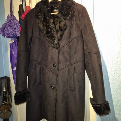 Lekker fuskepels kåpe fra By TiMo. Trykknapper foran. Foret. Pelsen består av 27% ull, 24% polyester, 49% acryl. Selve kåpen består av 50/50% ull/ polyester. Størrelse M. Lengde fra overkant skulder til skjørtekant ca 88 cm. Omkrets under armene ca 110 cm, liv ca 110 cm. Billigste porto. Se også mine øvrige annonser. Kan sendes med postnord kr 69.
