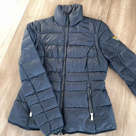 Lett dunjakke fra Cubus strl 158. Brukt av jente, har litt innsving i livet. (90% dun, 10% fjær) Uten hette. Lommer med glidelås. Mørkblå. Hel og fin.