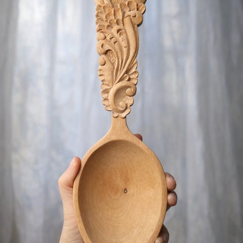 Dekorative tre-sleiver med vakker utskjæring. Den på bilde nr. 2 er lakkert. Kr. 329,- for den lakkerte og 400,- for den lengste og ulakkerte. Selges samlet for kr. 670,-. Bra håndtverk.