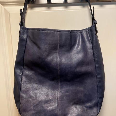 Hank kommer i tillegg. 2 glidelåser kan dras ned på h er side og vesken rommer da mye mer. Kr 250.-. Nr 1) Helt ny ubrukt veske I mørkeblått skinn. 33x43 cm Hank kommer i tillegg. Kr 250.-.