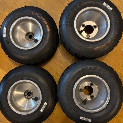 125mm brede, med lager (dette er framfelger til liten kart) selges kr 500,- per stk. Dette er altså felger man IKKE trenger boss til. Lager er til 17mm spindel.