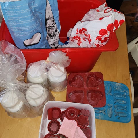 10 kilo gips og latexform av blomst og hjerte til telys samt et plast hjerte selges. 3 nisseformer kan følge med men jeg er usikker på om de er i orden.