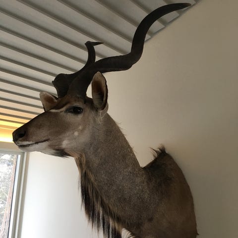 Selger et imponerende trofé med store spiralhorn (trolig kudu/antilope), montert på treskjold.