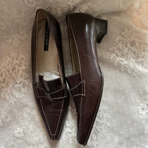 aura blanc vintage skinnsko / semsket sko / semsket pumps / semsket loafer / bysko / spasersko / pensko / spasersko / jobbsko / jeanssko / dresssko / damesko / sko til dame i semsket skinn i størrelse 38 / 5 med spiss tå lyse stikninger skinndekor / skinndusker