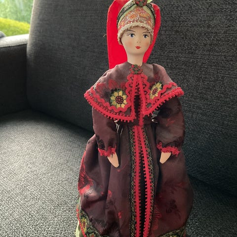 Fin dukke med samedrakt selges. Dukken er antatt av italiensk opprinnelse. Fine øyne. Kan sendes mot porto på 69,-