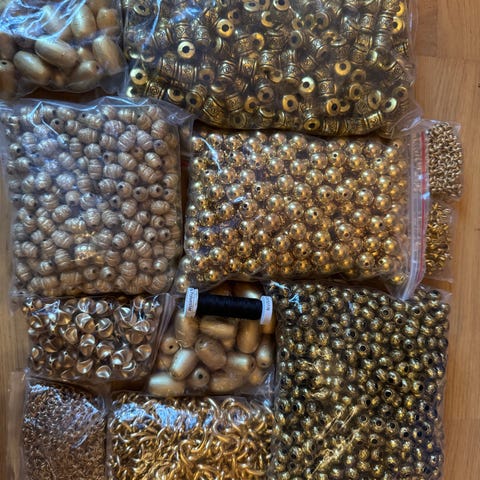 Sett til å lage armbånd av uten bruksanvisning. Pris er med porto for sending, kun vanlig post. Delene kan selvfølgelig brukes til annen produksjon av annet hver for seg. Kun vanlig post, ingen henting, ingen bud.