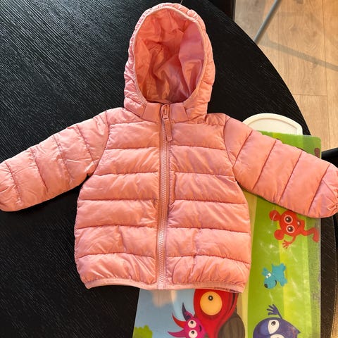 Pent brukt lett dunjakke i str 74. Svart med små spriker.