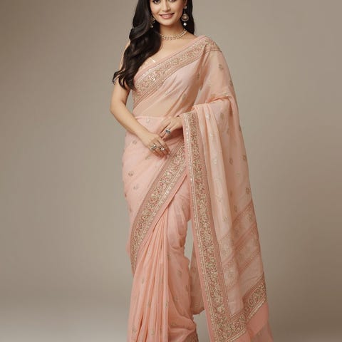 To farget sari i lavendel/lys lilla og mørk lilla. Nydelig og delikat håndarbeid med detaljer. Følger med bluse og underskjørt. Sari’en er lagt opp og sydd på med folder og hemper så den er lett å ta på seg.