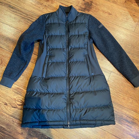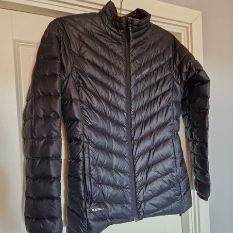 Nydelig sort halvlang dunkåpe fra Helly Hansen, str M. Den er kun brukt noen få ganger. Kraftig ytterstoff som gjør den slitesterk og vannavstøtende. 75% gåsedun og 25% gåsefjær.