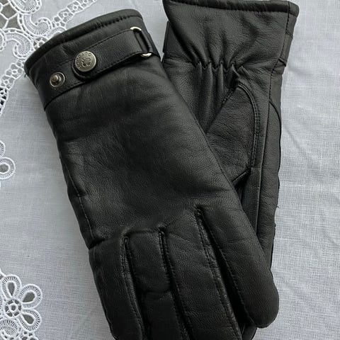 Stramming / justering med trykknapp. Vrangbord langs håndleddet. Forsterket stoff på innsiden.