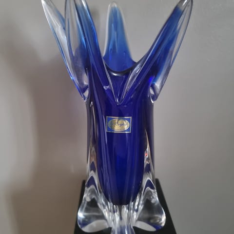 Jeg selger en nydelig ny ekte krystall blomster vase som har ett nydelig blad dekorasjon midten på vasen ,vasen er ca 25 -30 cm høy…porto kommer i tillegg til prisen