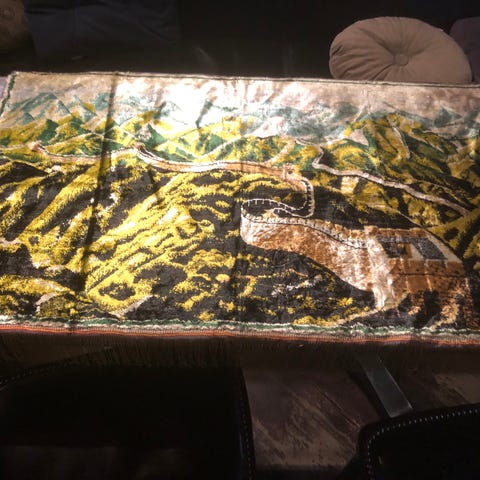 Vurderer og selge et Ekte Vintage håndlaget Silke veggteppe med egyptisk motiv. Er kjøpt fra Alexandria i Egypt på 1950 tallet.meget flott håndverk