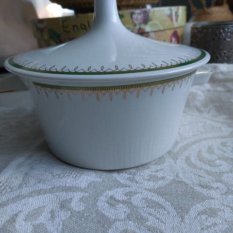 Stor terrin, skål selges og sausenebb i serien Market Turi Design / Figgjo. Terrinen er 23 cm. i dia og 12 cm. høy. God stand. Ønsker bud over kr. 300,- for terrinen. Skålen er ca. 17,5 x 10,5 cm. og 3,5 cm. høy. God stand. Ønsker bud over kr. 180,- for skålen. Sausenebbet har en sprekk og kan hvis ønskelig følge med på kjøpet. Hentes i Tønsberg eller pakkes godt og sendes for kr. 100.- inkl. sporing, forsikring og emballasje