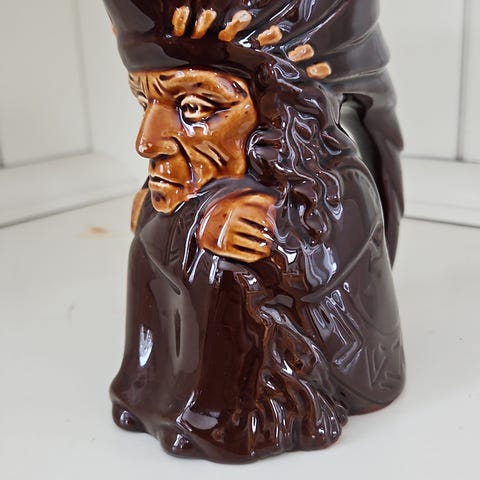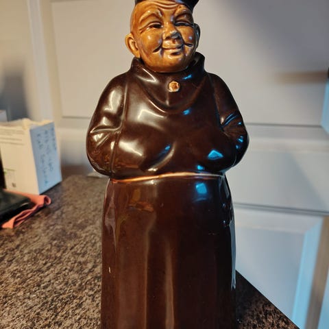 Flott munk med hode som kan taes av og brukes som karaffel. Se bilder. Høyde 25 cm. Det følger med 6 tønner (glass). Selges 120,- Sender post. Retro