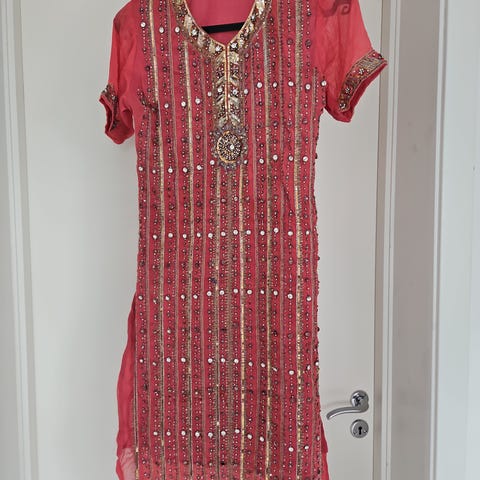 Denne er rålekker. Foret. Splitter i begge sider . Livet er 64 cm. Hel lengde 133cm. Er flekker ved den ene splitten. Har ikke prøvd å fjerne den. Perlebroderi