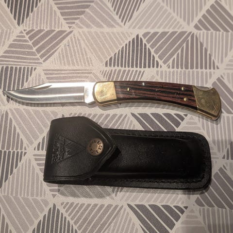 Kvalitetskniv fra Buck. Brukt på reinsjakt noen få turer. I topp stand som på bilder. Behagelig gumiert håndtak.