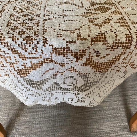 Gammel flott duk i offwhite, brune detaljer ca 115x142 cm