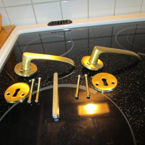 Langskilt i massiv messing med overflate i messing polert. Med nøkkelhull.