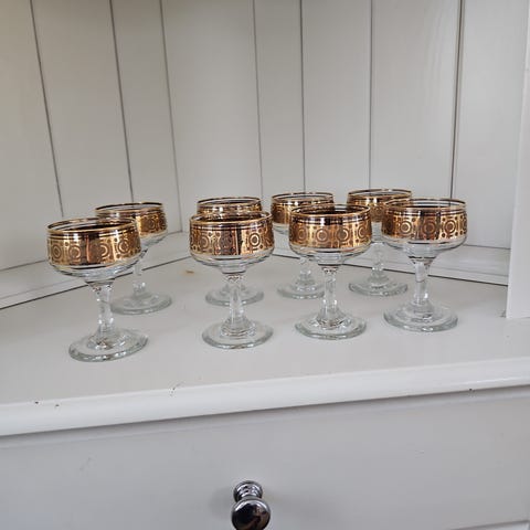 8 Nydelige røde likørglass med gullkant og gull stett.Se bilder!!