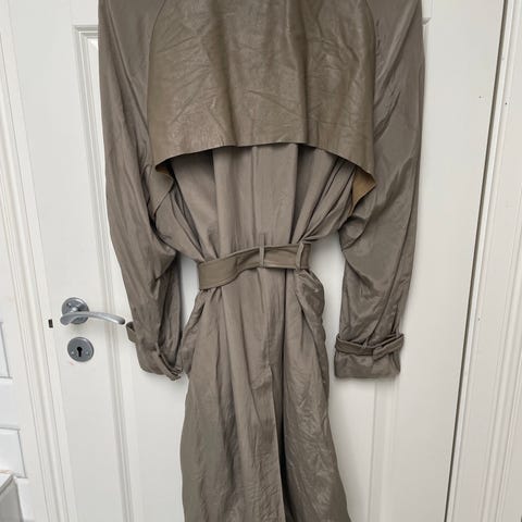 Kåpe i beige farge, størrelse L for kvinner. Kåpen har belte i livet og lang lengde, med detaljer som krage og lommer.