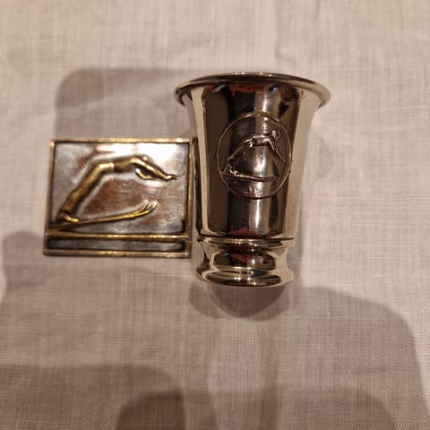 Kuvertaskebeger "10. Norgesløp (1939)" samt emaljert KNA-logo i rød emalje. Ustemplet sølv. (Testet i maskin). Trolig J. Tostrup.