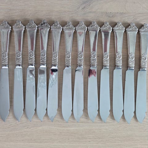 12 store spisekniver i sølvplett i mønster Vera. Knivene er veldig pene.