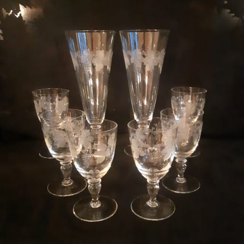 4 stk Champagneglass. Tsjekkisk krystallglass fra Bøhmen kjøpt i Praha på 90-tallet. Kanskje brukt 2-3 ganger, meget fine
