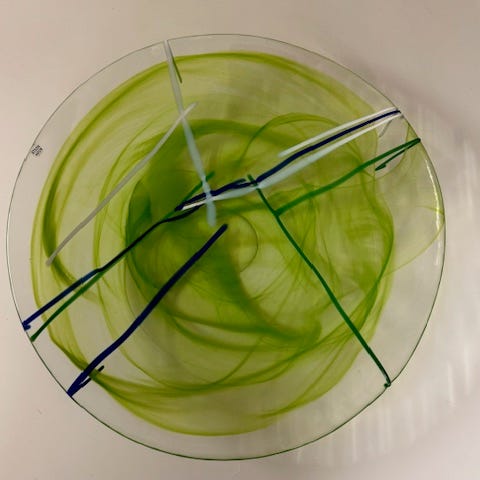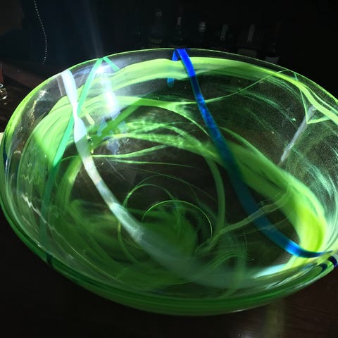 "Contrast från Kosta Boda tillverkas med en teknik som heter centrifugering, vilket skapar slöjor av färg inuti glasmassan. I kombination med färgade glaspinnar som adderas i processen, blir varje produkt unik. Design Anna Ehrner. 1.300 SEK"