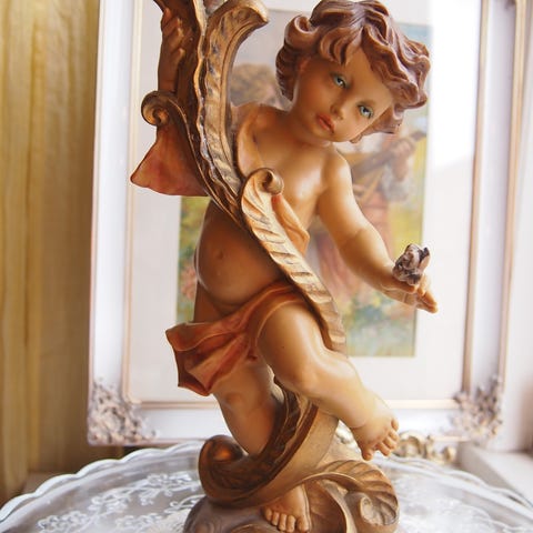 Vintage ‘Von Schierholz Plaue’ stake i porselen med Cherub som holder et overflødighetshorn/cornucopia…