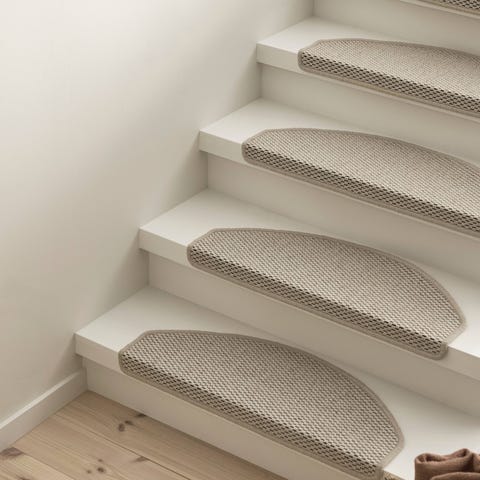 Disse mattene er laget av sterkt stoff med sisal-utseende slik at de er lyddempende, sklisikre, varme og komfortable. Trappeteppene kan vaskes og har en kant for å beskytte både trappetrinnsflaten og fremre kant. Den klebende teipen på baksiden gjør at mattene kan festes raskt og enkelt til trappen.