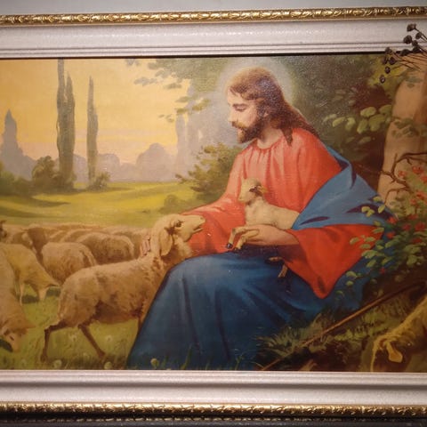 Trykk av jesusfigur i flott ramme.