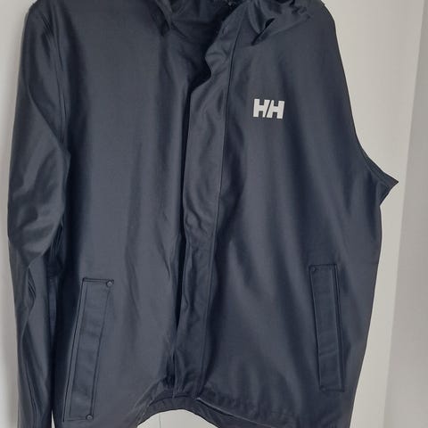 Ny, ubrukt sort tykk Helly Hansen kvalitets regnfrakk med et solid, kraftig stoff. Foret i ermene. Den har en fin romslig hette.
