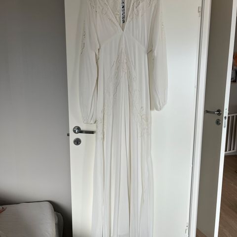 Nydelig jumpsuit for bruden som ønsker noe litt annerledes. Eller noen som bare vil være festfin. Fine broderier på ermene, åpen rygg og fin passform. Veldig behagelig å ha på å dette. Selger det ubrukte plagget i feil størrelse som jeg aldri fikk returnert. Str 40.