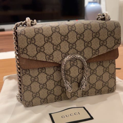 En ikonisk og elegant veske fra Gucci. Denne Dionysus-modellen small er laget i beige GG Supreme monogram med stilige semskede detaljer og den karakteristiske dobbelt-hode tiger-spennen i antikk sølvfarge – et design inspirert av gresk mytologi.
