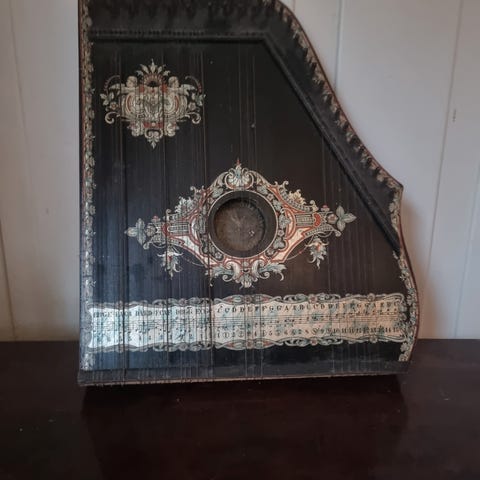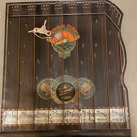 harpeleik zither h 53 cm b 43 cm noe slitt selges som repobjekt noen def strenger selges for 600 kr